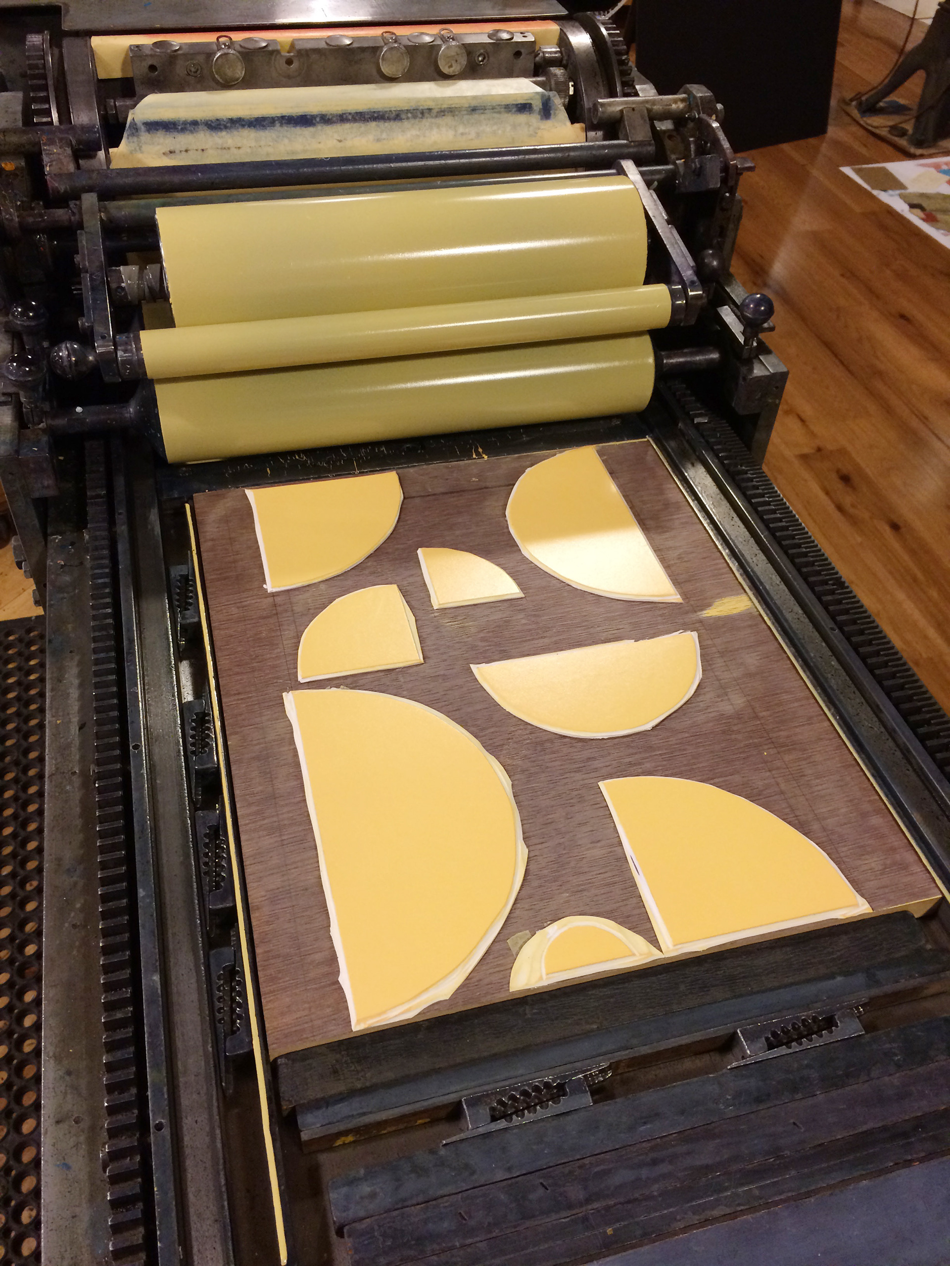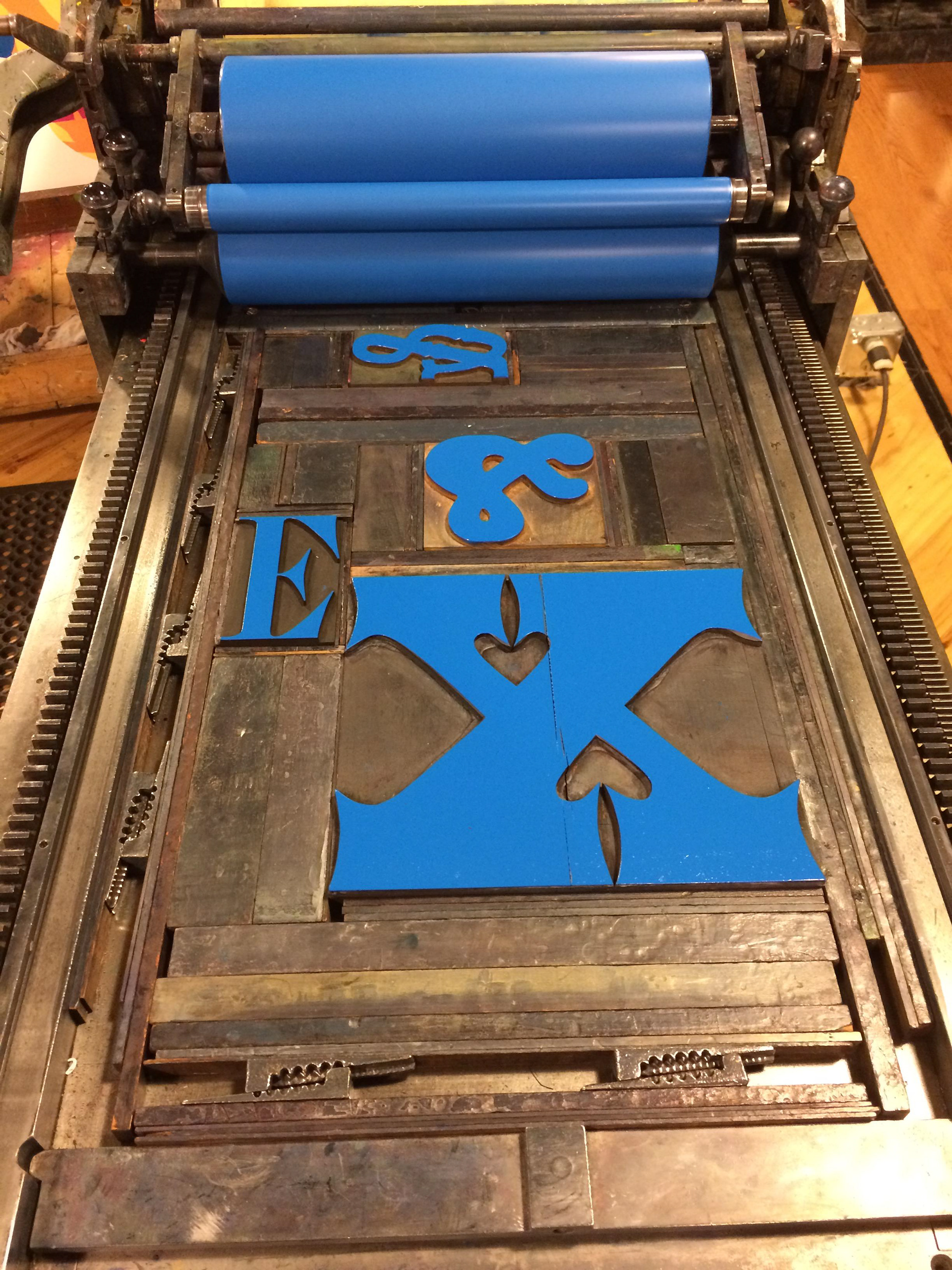 For the Hamilton Wood Type & Printing Museum's 20th anniversary, Jennifer Farrell of Starshaped Press created a poster project to raise funds for the museum. Multiple printers were invited to create a print, which were then released each month throughout 2019. The printers were given creative freedom and the only requirements were that they use wood type and say "Ham at 20" somewhere. This print was created in collaboration with Cathy Batliner. We went a more abstract route, showcasing the wood type from Hatch's collection. The best typographical moments were stenciled out in shapes reminiscent of Hamilton's maple half rounds, which the type is cut from. The stenciling was done by using a cut paper stencil on top of the print and the tympan on the press cut in select places.