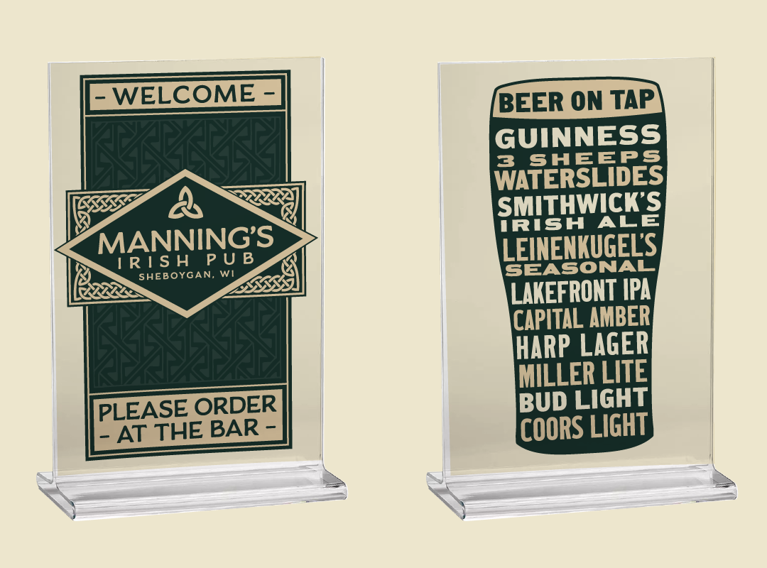Wisconsin has a bar culture akin to Irish pubs, where the sense of community is as much if not more important than the drinks. What initially started as some new apparel for Manning's eventually turned into new logos and branding for the bar. I wanted to avoid the cliche "Irish pub" aesthetic of shamrocks and kelly green. I drew inspiration from some of the hand painted signs of traditional Irish pubs and the design work of Louise Fili. Celtic line patterns and a unity knot were used to symbolize that sense of community Manning's has. The bar was pleased with the outcome so much so, that they adopted the look throughout the bar. Glassware, wall paint colors, table tents, and menus were adapted to the new branding.