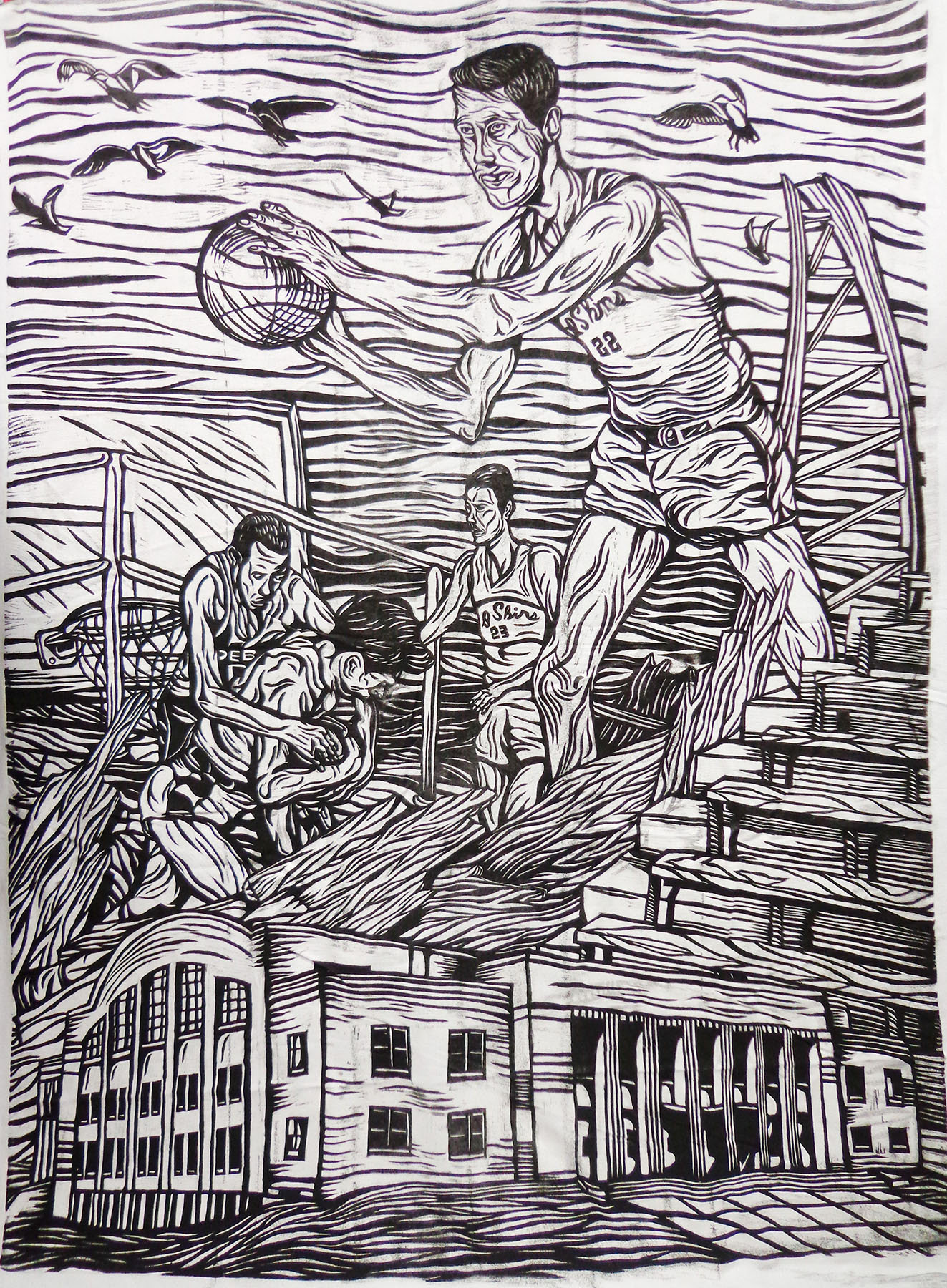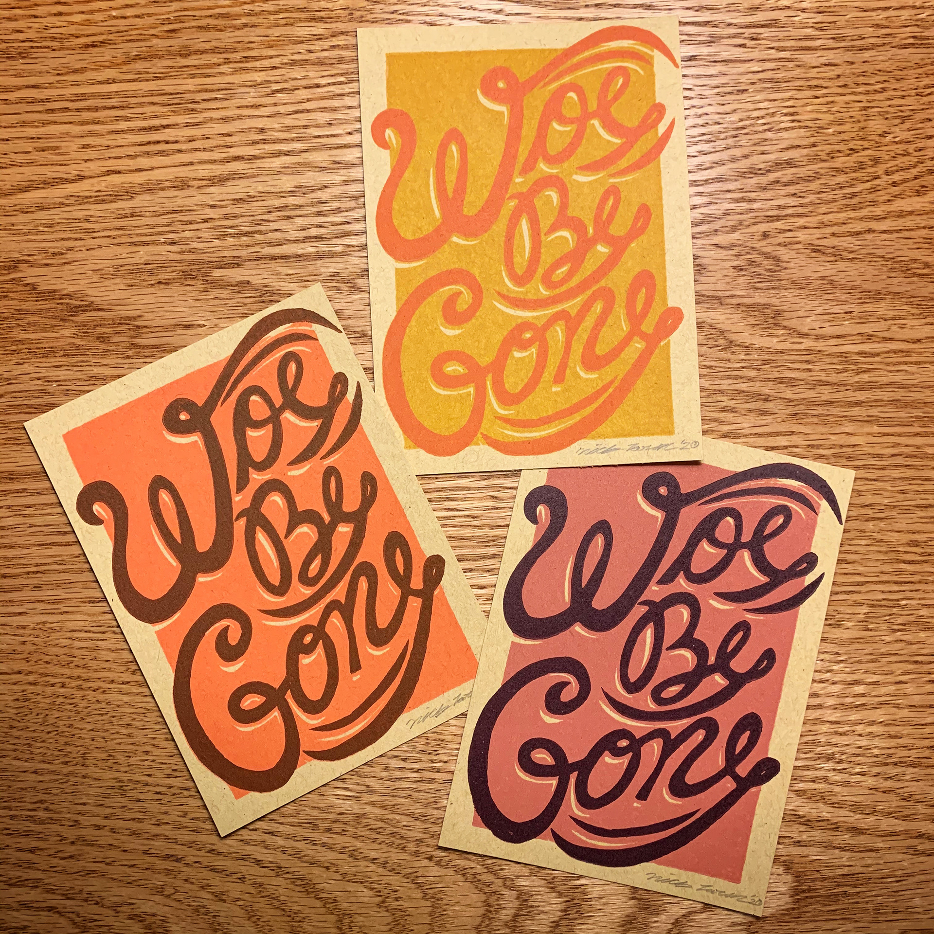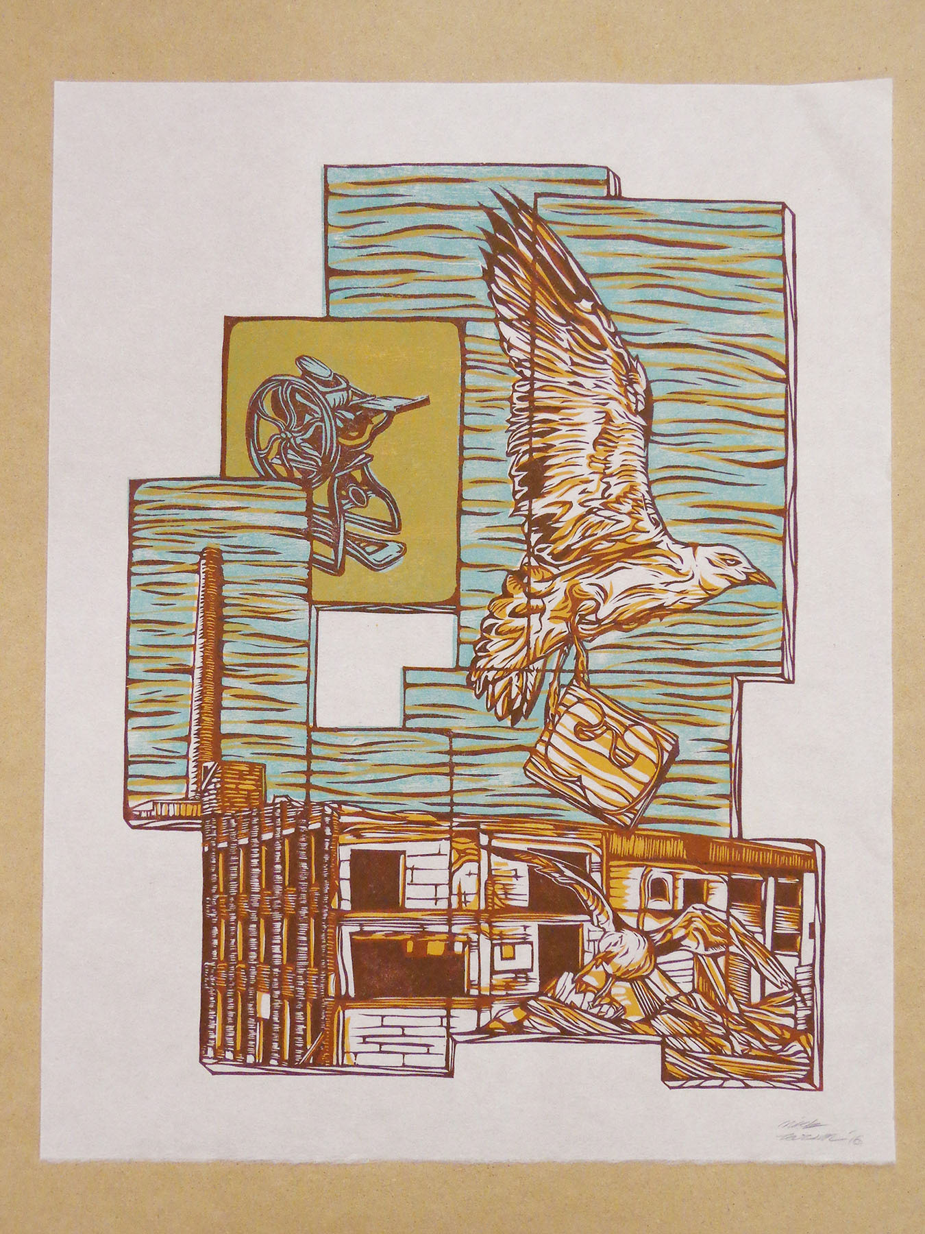 I focus on primarily relief printmaking for my personal work. All of these pieces are hand carved MDF blocks and are either reduction or multiple block prints. Some have spray paint stencils for additional color.